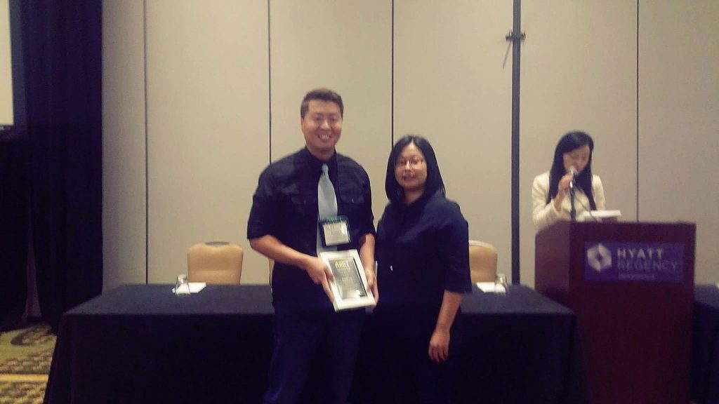 “I sincerely thank the Association for Educational Communications and Technology for honoring me with this 2017 Young Researcher Award. Let me tell you that it is not just my sole effort that has brought me here. Winning this Young Researcher Award would not have been possible without the inspiration I have received from my mentors, Drs. Krista Glazewski, Tomas Brush, Curtis Bonk, John Hitchcock, Charles Reigeluth, and Colin Allen at Indiana University, Dr. Paul Kim at Stanford University, Drs. Cheolil Lim and Ilju Rha at Seoul National University, and my colleagues, for whom I have the deepest respect, and from whom I have derived the strength to challenge myself and perform better at each stage.”
