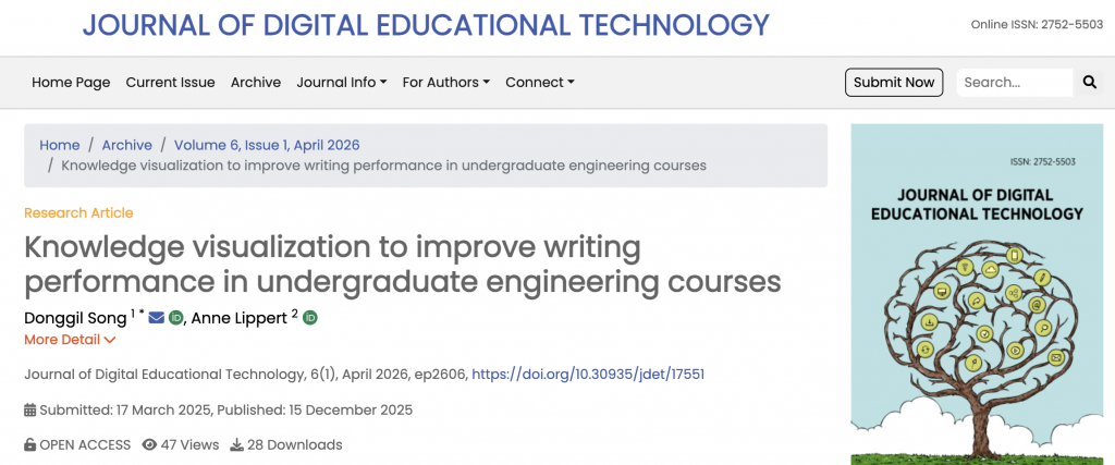 Reference: Song, D., & Lippert, A. (2026). Knowledge visualization to improve writing performance in undergraduate engineering courses. Journal of Digital Educational Technology, 6(1), ep2606.  https://doi.org/10.30935/jdet/17551